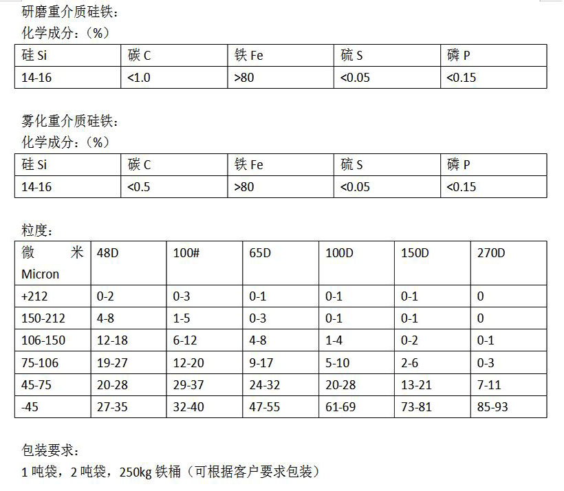 实际生产中应用较多的还是是山东重介质硅铁,这是一种专门冶炼成的硅山东铁合金,具有耐氧化,硬度大,带强磁性等特点。使用后经过筛分和磁选回收,可以返回再用。硅铁中含硅小于13%时,韧性增加,给磨碎制备带来困难,而且在水中易于氧化,当含硅超过18%时,磁性减弱不便回收。故以含硅13%-18%,含铁87%-82%的硅铁较适合使用。