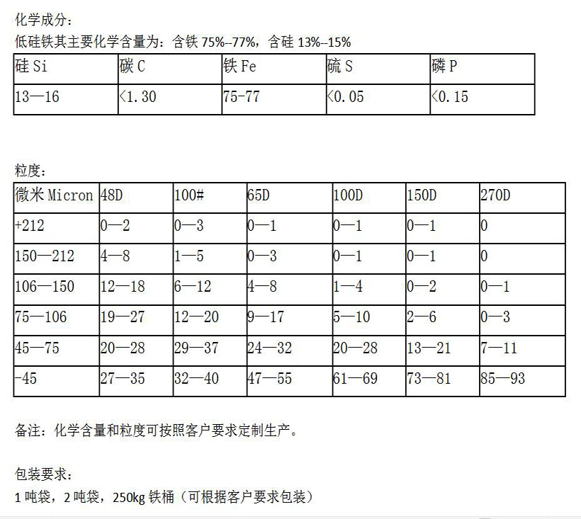 24h咨询热线18749305337选矿用山东低硅铁粉是一种粉末状的金属粉,主要是由电炉冶炼而成的。一般情况下山东选矿用低硅铁粉主要用于废铝分选,金矿,钻石矿,铜矿等。山东重介质选矿的原理很好理解,任何重力分选过程,都是在一定的介质中进行。若所使用的分选介质其密度大于每立方米1克时,这种介质称为重介质。